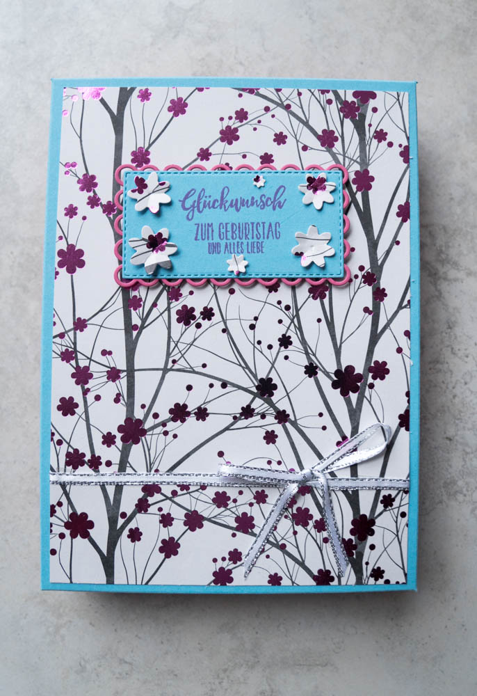 Ich habe dann nur noch ein Etikett gestaltet und mit Dimensionals (3‑D-Klebepads) angebracht. Bei der Gestaltung sind deiner Kreativität keine Grenzen gesetzt. Die Karte dazu, ist aus den Resten von den Papieren entstanden. Die Farbenauswahl habe ich anhand des E‑Books getroffen. Die Papiere sind noch aus alten Beständen.