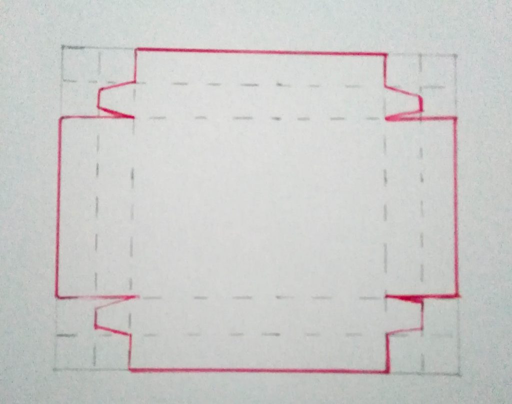 Dann schneidest du die beiden Teile wie auf dem Bild zu sehen ist. Die leicht angeschrägten kleinen Stücke geben die Klebelaschen.